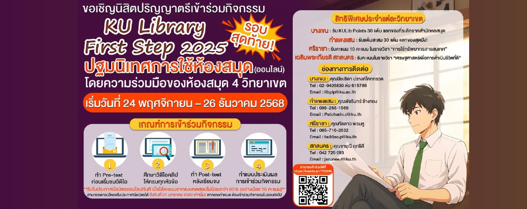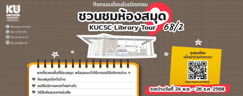 KU Library Catalog (OPAC) One Search KU+ : Search Other Thai Libraries KU Library Catalog (OPAC) สืบค้นเฉพาะทรัพยากรสารสนเทศของห้องสมุดมหาวิทยาลัยเกษตรศาสตร์ ผู้แต่ง ชื่อเรื่อง หัวเรื่อง คำสำคัญ สำนักพิมพ์ ISBN/ISSN เลขหมู่ LC เลขหมู่ NLM เลขหมู่ Dewey เลขหมู่ระบบอื่น Advance Search One Search สืบค้นภายในครั้งเดียวจาก ฐานข้อมูลทรัพยากรสารสนเทศและฐานข้อมูลออนไลน์ที่ห้องสมุดมหาวิทยาลัยเกษตรศาสตร์ให้บริการ คำสำคัญ ชื่อเรื่อง ผู้แต่ง KU+ : Search Other Thai Libraries สืบค้นภายในครั้งเดียวจาก ฐานข้อมูลทรัพยากรสารสนเทศของห้องสมุดมหาวิทยาลัยเกษตรศาสตร์ และห้องสมุดเครือข่ายสถาบันอื่น คำสำคัญ ชื่อเรื่อง ผู้แต่ง ข่าวประชาสัมพันธ์ “ชวนชมห้องสมุด KUCSC Library Tour” ประจำปีการศึกษา 2568 ภาคเรียนที่ 2 Posted on18 November 202518 November 2025 กิจกรรม “ปฐมนิเทศการใช้ห้องสมุด (Online) Library First Step โดยความร่วมมือของห้องสมุด 4 วิทยาเขต ประจำปีการศึกษา 2568 ภาคเรียนที่ 2 (กิจกรรมระหว่างวันที่ 24 พฤศจิกายน 2568 – 26 ธันวาคม 2568) Posted on18 November 202518 November 2025 กิจกรรม “ปฐมนิเทศการใช้ห้องสมุด (Online) Library First Step” Posted on26 November 202426 November 2024 กิจกรรมต้อนรับเปิดเทอม ‘ ชวนชมห้องสมุด KUCSC Library Tour ‘ ประจำปีการศึกษา 2567 ภาคเรียนที่ 2 Posted on25 November 202426 November 2024 เชิญชวนนิสิต มก.ฉกส.ทุกชั้นปี ร่วมกิจกรรม Good Stories@KU.CSC “เรื่องดีดีที่อยากเล่า ที่ ม.เกษตรศาสตร์ฯ สกลนคร” Posted on18 September 202418 September 2024 รับส่วนลดค่าธรรมเนียมการตีพิมพ์บทความ (APC) 10% สำหรับวารสาร MDPI ทุกฉบับ และส่วนลด 15% สำหรับบริการแก้ไขภาษาโดย MDPI ตั้งแต่วันนี้ – 31 สิงหาคม 2568 Posted on18 September 202418 September 2024 ห้องสมุด มก.ฉกส.