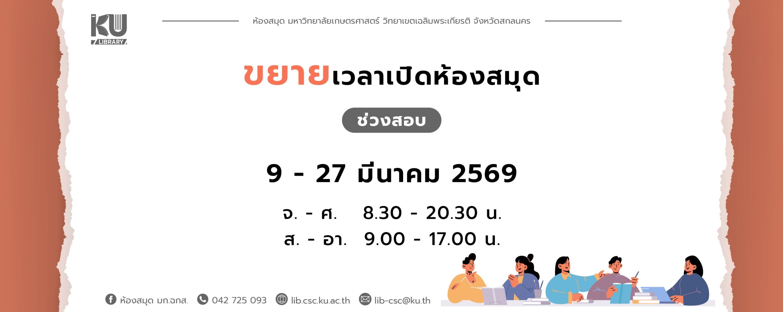 ห้องสมุดเปิดทำการอยู่ในขณะนี้เวลาทำการ: 8:30 น. – 16:30 น. การค้นหา: KU Library Catalog (OPAC) เลือกการค้นหา: KU Library Catalog (OPAC) One Search KU+ : Search Other Thai Libraries ผู้แต่ง ชื่อเรื่อง หัวเรื่อง คำสำคัญ สำนักพิมพ์ ISBN/ISSN เลขหมู่ LC เลขหมู่ NLM เลขหมู่ Dewey เลขหมู่ระบบอื่น Keyword Title Author Keyword Title Author ข่าวประชาสัมพันธ์ งดให้บริการพื้นที่อาคารอ่าน 24 ชั่วโมง ในช่วงงานเกษตรแฟร์ ระหว่างวันที่ 15 – 23 ธันวาคม 2568 Posted on15 December 202515 December 2025 “ชวนชมห้องสมุด KUCSC Library Tour” ประจำปีการศึกษา 2568 ภาคเรียนที่ 2 Posted on18 November 202518 November 2025 กิจกรรม “ปฐมนิเทศการใช้ห้องสมุด (Online) Library First Step โดยความร่วมมือของห้องสมุด 4 วิทยาเขต ประจำปีการศึกษา 2568 ภาคเรียนที่ 2 (กิจกรรมระหว่างวันที่ 24 พฤศจิกายน 2568 – 26 ธันวาคม 2568) Posted on18 November 202518 November 2025 กิจกรรม “ปฐมนิเทศการใช้ห้องสมุด (Online) Library First Step” Posted on26 November 202426 November 2024 กิจกรรมต้อนรับเปิดเทอม ‘ ชวนชมห้องสมุด KUCSC Library Tour ‘ ประจำปีการศึกษา 2567 ภาคเรียนที่ 2 Posted on25 November 202426 November 2024 เชิญชวนนิสิต มก.ฉกส.ทุกชั้นปี ร่วมกิจกรรม Good Stories@KU.CSC “เรื่องดีดีที่อยากเล่า ที่ ม.เกษตรศาสตร์ฯ สกลนคร” Posted on18 September 202418 September 2024 ห้องสมุด มก.ฉกส.