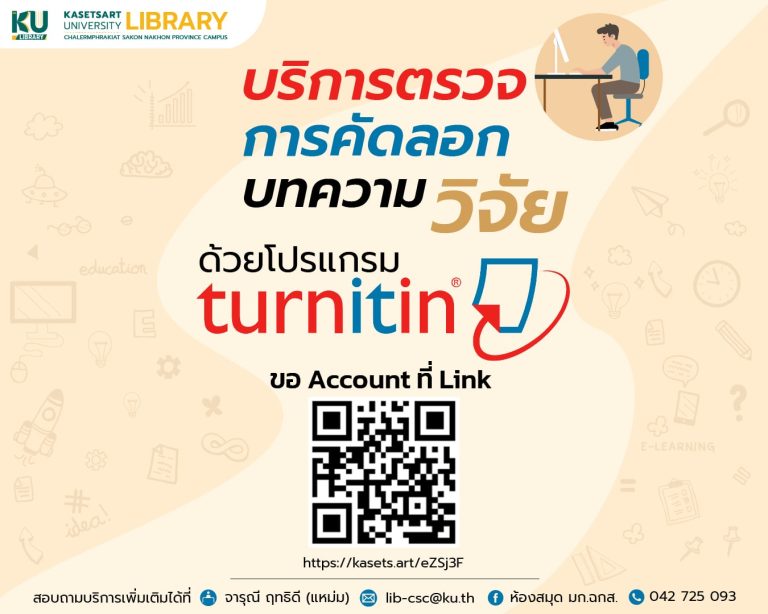 1. กรอก แบบฟอร์ม เพื่อขอสิทธิ์ใช้งาน 2. ภายใน 3 วันทำการ จะได้รับอีเมล จาก – ห้องสมุด : จะส่งข้อมูลที่ต้องใช้ในการ Setup – Turnitin : จะส่งลิงก์ เพื่อให้ Setup Account ** กรุณาตรวจสอบ Inbox หรือ Spam box ** 3. ใช้งานผ่านเว็บไซต์ www.turnitin.com | 1. กรอก แบบฟอร์ม เพื่อขอสิทธิ์ใช้งาน 2. ภายใน 3 วันทำการ ห้องสมุดจะส่งข้อมูลสำหรับเข้าใช้งาน Turnitin ให้ทางอีเมล @ku.th ** กรุณาตรวจสอบ Inbox หรือ Spam box ** 3. ใช้งานผ่านเว็บไซต์ www.turnitin.com ** การใช้งานครั้งแรก ต้อง Create User (เลือก Student) ** |